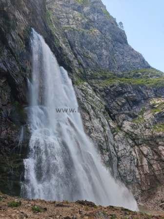 Поток воды падает с высоты 70 метров и с шумом разбивается о камни, создавая на скале мраморные узоры и миллионы радужных брызг. Вода в водопаде ледяная, а у подножия горы обычно лежит снежный сугроб, который сохраняется до конца лета. Слева от водопада находится грот, образованный выходом воды из боковых расщелин.